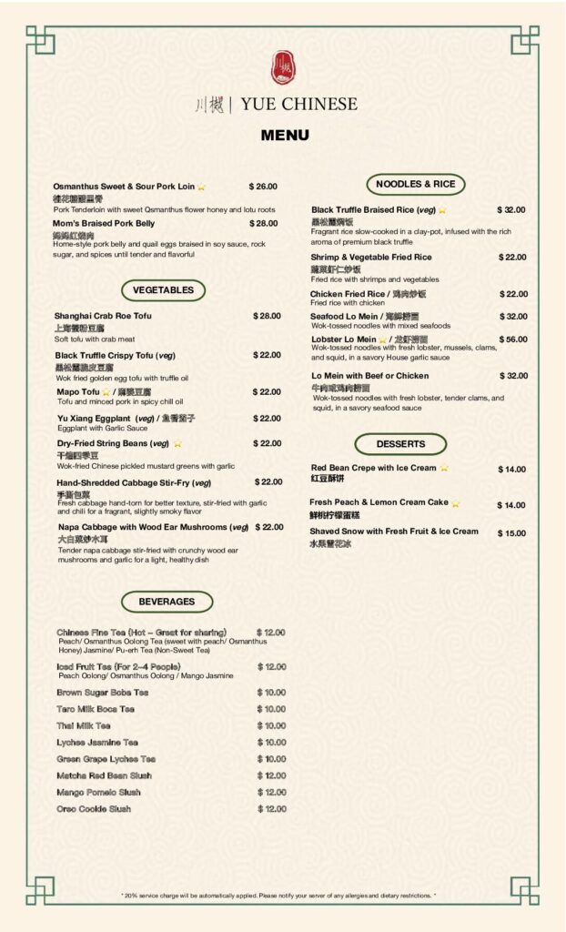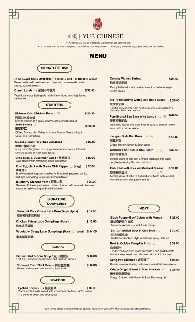 Embark on a culinary journey where tradition meets innovation in every bite. At Yue, each dish is crafted to offer a perfect balance of flavor and artistry, making every meal an unforgettable experience. The menu was developed to reflect both heritage and innovation, aiming to introduce miami to a new era of Chinese dining.