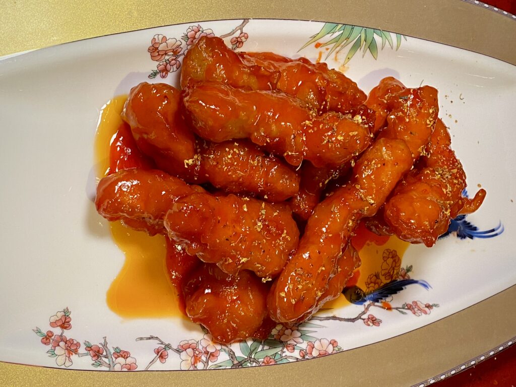 A refined twist on the classic sweet and sour pork. Tender pork strips are lightly battered and fried to a golden crisp, then glazed in a tangy-sweet sauce accented with osmanthus syrup. The dish combines fruity aroma, crispy texture, and a delicate floral note, offering a harmonious balance of flavor and elegance.